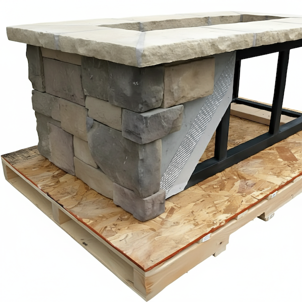 You may finish the kit with stone veneer, tile, stucco, or other materials of your choosing. Be sure to account for material thickness when estimating final dimensions (see answer to Q1). Also verify local codes and proper ventilation, and ensure your fuel line and clearance meet the burner manufacturer’s recommendations.